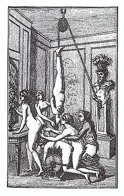« Depuis que je ne puis plus lire ni écrire (de janvier à juillet 83, Sade perd presque totalement l’usage d’un œil), voilà le cent onzième supplice que j’invente pour elle (sa belle-mère Madame de Montreuil). Ce matin, je la voyais écorchée vive, traînée sur des chardons et jetée ensuite dans une cuve de vinaigre. Et je lui disais : exécrable créature, voilà, pour avoir vendu ton gendre à des bourreaux ! Voilà, pour avoir ruiné et déshonoré ton gendre ! Voilà, pour lui avoir fait perdre les plus belles années de sa vie, quand il ne tenait qu’à toi de le sauver après son jugement[36] ! »