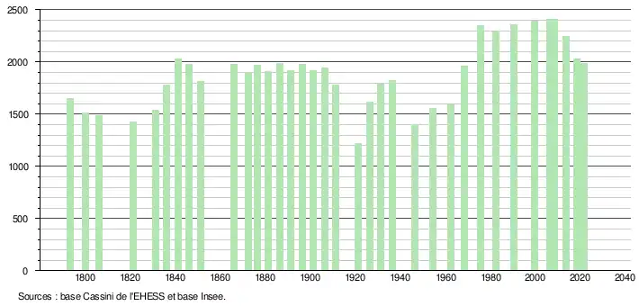 L'évolution du nombre d'habitants est connue à travers les recensements de la population effectués dans la commune depuis 1793. Pour les communes de moins de 10 000 habitants, une enquête de recensement portant sur toute la population est réalisée tous les cinq ans, les populations légales des années intermédiaires étant quant à elles estimées par interpolation ou extrapolation[32]. Pour la commune, le premier recensement exhaustif entrant dans le cadre du nouveau dispositif a été réalisé en 2008[33].
