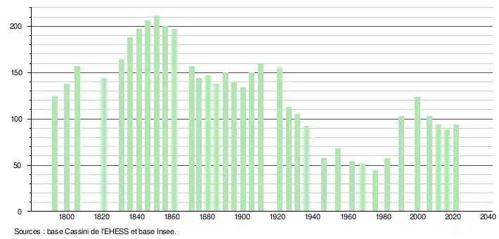 L'évolution du nombre d'habitants est connue à travers les recensements de la population effectués dans la commune depuis 1793. Pour les communes de moins de 10 000 habitants, une enquête de recensement portant sur toute la population est réalisée tous les cinq ans, les populations légales des années intermédiaires étant quant à elles estimées par interpolation ou extrapolation[15]. Pour la commune, le premier recensement exhaustif entrant dans le cadre du nouveau dispositif a été réalisé en 2006[16].