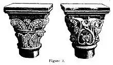 Les débris des XIe siècle et du XIIe siècle, déterrés dans les décombres, sont assez nombreux : ils consistent principalement en fragments de chapiteaux, (figure 3) de bas-reliefs et de moulures, sans que nous puissions déterminer à quelle partie de l’édifice ils ont appartenu.