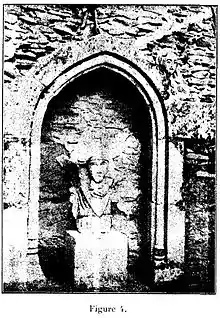 La statue de saint Denis, qui y est déposée entre ses piédroits, est du XIe siècle ; elle vient de l’église de la Ferté-Macé (Orne).