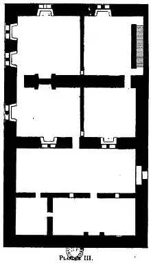 L’ancien gîte intérieur fut remplacé par un bâtiment A et B de 16 mètres de profondeur qu’on adossa à la muraille septentrionale du quadrilatère, et l’escalier qui devait le desservir dut être rétabli dans la muraille à l’est. Ce bâtiment élevé d’un rez-de-chaussée et d’un étage sous sol, se composait de 2 salles à chaque section horizontale.