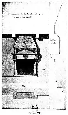 De cette époque il ne reste, à part les murailles réparées, que 3 cheminées, dont l’une, précédemment reproduite planche IV, est dans la galerie ; les 2 autres, qui sont endommagées, restent attachées au mur de refend, dans le grenier au nord. Le couronnement d’un jambage de l’une de celles-ci est déposé comme l’objet de musée, dans la cour, au droit du pont-levis.