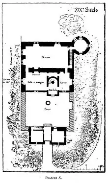 Ces bâtiments intérieurs qui devaient être construits en bois, étaient éclairés sur la cour. La seule ouverture qui régnât dans les murailles extérieures était la porte d’entrée, dont il reste encore un jambage et un bout de linteau en granite, à six mètres au-dessus du fond des fossés.