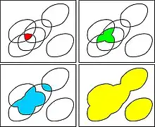 Une approche d'appartenance à l'ensemble considère que l'incertitude correspondant à la mesure d'une variable aléatoire x est représentée par un ensemble Xi (au lieu d'une fonction de densité de probabilité). Si aucune donnée aberrante n’apparaît, x appartient à l'intersection de tous les Xi. Si une donnée aberrante apparaît, cette intersection est vide et nous relâchons un petit nombre de Xi (aussi petit que possible) afin d'éviter toute incohérence[24]. Cela peut être fait en utilisant la notion d'intersection q-relâchée. Comme illustré par la figure, l'intersection q-relâchée correspond à l'ensemble de tous les x qui appartiennent à tous les ensembles Xi exceptés q d'entre eux. Les ensembles Xi qui ne coupent pas l'intersection q-relâchée peuvent être soupçonnés de rassembler des données aberrantes.