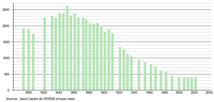 L'évolution du nombre d'habitants est connue à travers les recensements de la population effectués dans la commune depuis 1793. Pour les communes de moins de 10 000 habitants, une enquête de recensement portant sur toute la population est réalisée tous les cinq ans, les populations légales des années intermédiaires étant quant à elles estimées par interpolation ou extrapolation[20]. Pour la commune, le premier recensement exhaustif entrant dans le cadre du nouveau dispositif a été réalisé en 2006[21].