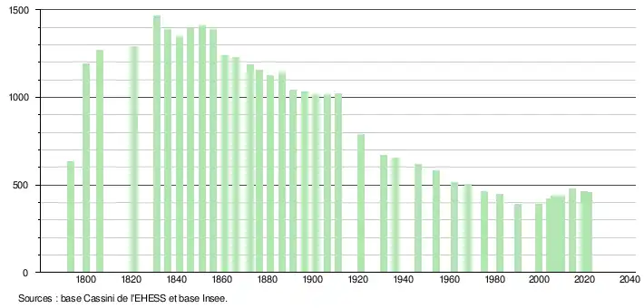 L'évolution du nombre d'habitants est connue à travers les recensements de la population effectués dans la commune depuis 1793. Pour les communes de moins de 10 000 habitants, une enquête de recensement portant sur toute la population est réalisée tous les cinq ans, les populations légales des années intermédiaires étant quant à elles estimées par interpolation ou extrapolation[27]. Pour la commune, le premier recensement exhaustif entrant dans le cadre du nouveau dispositif a été réalisé en 2004[28].