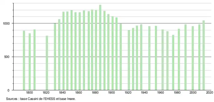 L'évolution du nombre d'habitants est connue à travers les recensements de la population effectués dans la commune depuis 1793. À partir du , les populations légales des communes sont publiées annuellement dans le cadre d'un recensement qui repose désormais sur une collecte d'information annuelle, concernant successivement tous les territoires communaux au cours d'une période de cinq ans. Pour les communes de moins de 10 000 habitants, une enquête de recensement portant sur toute la population est réalisée tous les cinq ans, les populations légales des années intermédiaires étant quant à elles estimées par interpolation ou extrapolation[49]. Pour la commune, le premier recensement exhaustif entrant dans le cadre du nouveau dispositif a été réalisé en 2007[50],[Note 3].