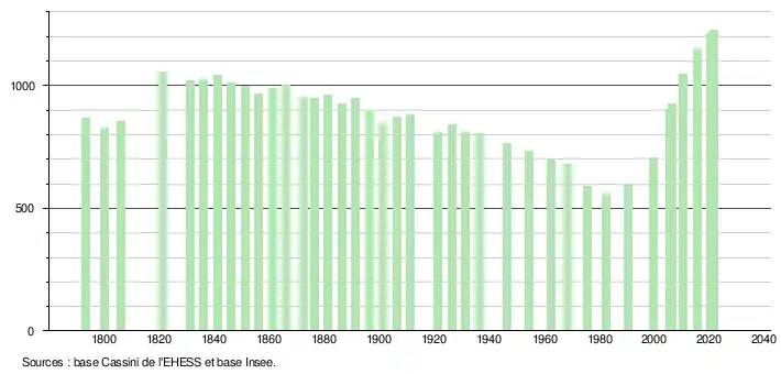 L'évolution du nombre d'habitants est connue à travers les recensements de la population effectués dans la commune depuis 1793. Pour les communes de moins de 10 000 habitants, une enquête de recensement portant sur toute la population est réalisée tous les cinq ans, les populations légales des années intermédiaires étant quant à elles estimées par interpolation ou extrapolation[41]. Pour la commune, le premier recensement exhaustif entrant dans le cadre du nouveau dispositif a été réalisé en 2005[42].