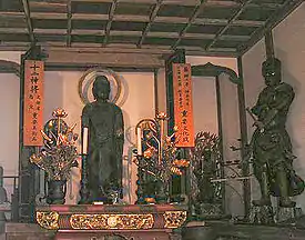Bouddha Bhaisajyaguru (au centre) accompagné par un des douze généraux célestes