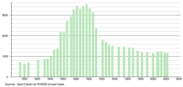 L'évolution du nombre d'habitants est connue à travers les recensements de la population effectués dans la commune depuis 1793. Pour les communes de moins de 10 000 habitants, une enquête de recensement portant sur toute la population est réalisée tous les cinq ans, les populations légales des années intermédiaires étant quant à elles estimées par interpolation ou extrapolation[32]. Pour la commune, le premier recensement exhaustif entrant dans le cadre du nouveau dispositif a été réalisé en 2007[33].