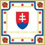 « Au centre d'un champ blanc est arboré l'écu national de la République slovaque ; sous l'écu la devise d'or “VERNÍ SEBE SVORNE NAPRED[note 1]” ; dans chaque coin du champ une rose héraldique entrecroisée d'une flèche d'or. Sur chaque côté, entre les roses héraldiques, sont situées trois double croix au bras semblable de couleur rouge. Le tout est entouré d'un cordon azur en forme de croix et encadré d'une décoration en or [21]. »