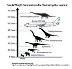 La taille et la masse du spécimen type de Dreadnoughtus schrani, MPM-PV 1156, un animal presque adulte, sont estimées lors de sa description en 2014 à 26 m pour une masse de 60 t[1]. Cette dernière valeur a eu un grand succès médiatique, car Dreadnoughtus était considéré alors comme l'animal le plus lourd ayant jamais vécu sur Terre (pour un dinosaure connu par deux spécimens dont on connait suffisamment d'os qui permettent une évaluation avec une certitude raisonnable).