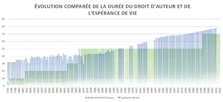 La durée des droits patrimoniaux couvre la vie de l'auteur. À la mort de l'auteur, ces droits persistent au bénéfice de ses ayants droit pendant l'année civile en cours et les soixante-dix années qui suivent[20] (avant la loi du 27 mars 1997, c'était seulement cinquante ans).