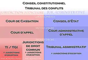 Le droit français peut être divisé en deux grandes branches, droit public et droit privé, elles-mêmes respectivement subdivisées en deux branches du droit (droit administratif et droit constitutionnel ; droit civil et droit pénal).