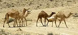 Le dromadaire (Camelus dromedarius), ou chameau d'Arabie, est une espèce de chameau, mammifère artiodactyle de la famille des camélidés[1]. Pour cette raison, qualifier un dromadaire de « chameau » n'est pas erroné mais juste moins précis ; les espèces nommées couramment « chameau » présentent deux bosses, alors que le dromadaire n'en possède qu'une seule. Le terme dromadaire est tiré du grec δρομάς κάμηλος / dromás kámêlos, « chameau qui court ». Il est parfois surnommé « vaisseau du désert » (safînat as‑Saḥrâ’ en arabe)[2].