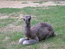 La femelle est rarement mise au mâle avant l'âge de quatre ans et peut être reproductrice jusqu'à l'âge de vingt ans. Au cours de sa vie, elle portera de trois à sept chamelons. La durée de gestation est de treize mois. Au moment de la mise bas, la chamelle s'écarte du troupeau et se met en position baraquée ; il existe un risque que le chamelon soit écrasé ou étouffé sous sa mère. Au cours de son développement, le fœtus commence par avoir deux bosses qui fusionnent pendant la gestation[14].