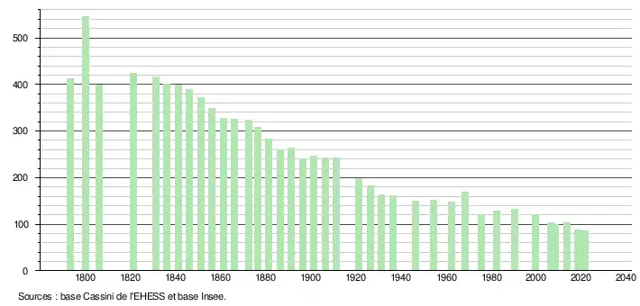 L'évolution du nombre d'habitants est connue à travers les recensements de la population effectués dans la commune depuis 1793. Pour les communes de moins de 10 000 habitants, une enquête de recensement portant sur toute la population est réalisée tous les cinq ans, les populations légales des années intermédiaires étant quant à elles estimées par interpolation ou extrapolation[31]. Pour la commune, le premier recensement exhaustif entrant dans le cadre du nouveau dispositif a été réalisé en 2008[32].
