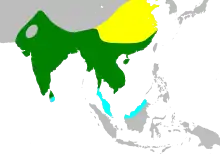 Cet oiseau réside dans une grande partie du sud de l'Asie tropicale depuis le sud-ouest de l'Iran en passant par l'Inde et l'est du Sri Lanka au sud de la Chine et l'Indonésie.