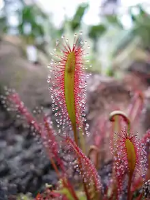 Les feuilles de droséra sont recouvertes de poils de taille comprise entre quelques millimètres et un centimètre. Au bout de chacun de ces poils se trouve la zone endodermoïde, pied d'un amas — qui peut être, en fonction de l'espèce, transparent, vert[N 1] ou rouge[N 2] — de cellules sécrétant le mucilage (le parenchyme glandulaire).