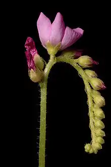 Chaque plante adulte produit, de mai à octobre, des hampes florales pouvant atteindre 25 cm. Chacune de ces hampes florales porte jusqu'à 20 petites fleurs magenta d'environ 3 cm de diamètre qui s'ouvriront de façon progressive. Les fleurs étant auto-fécondes, elles libéreront des dizaines de fines graines noires, que l'on peut semer au printemps.