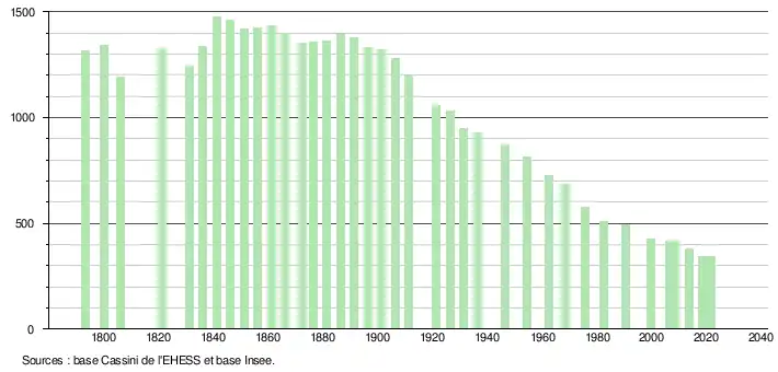 L'évolution du nombre d'habitants est connue à travers les recensements de la population effectués dans la commune depuis 1793. Pour les communes de moins de 10 000 habitants, une enquête de recensement portant sur toute la population est réalisée tous les cinq ans, les populations légales des années intermédiaires étant quant à elles estimées par interpolation ou extrapolation[27]. Pour la commune, le premier recensement exhaustif entrant dans le cadre du nouveau dispositif a été réalisé en 2008[28].
