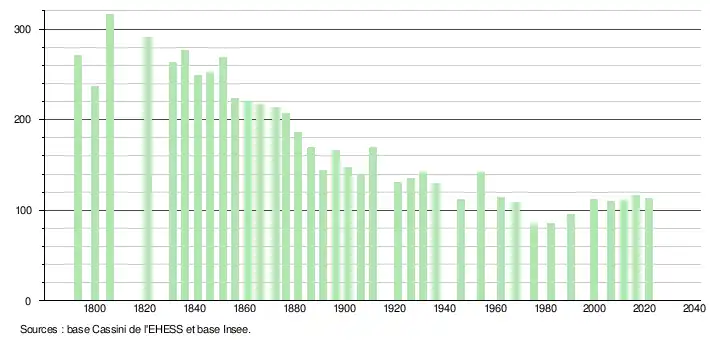 L'évolution du nombre d'habitants est connue à travers les recensements de la population effectués dans la commune depuis 1793. Pour les communes de moins de 10 000 habitants, une enquête de recensement portant sur toute la population est réalisée tous les cinq ans, les populations légales des années intermédiaires étant quant à elles estimées par interpolation ou extrapolation[25]. Pour la commune, le premier recensement exhaustif entrant dans le cadre du nouveau dispositif a été réalisé en 2006[26].