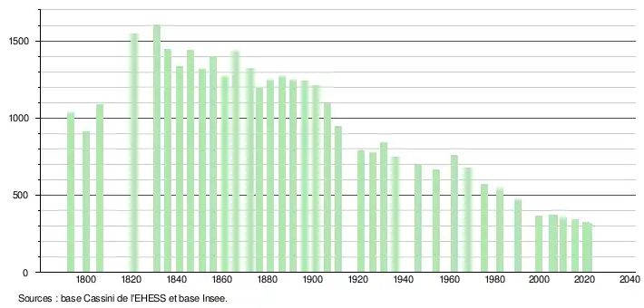 L'évolution du nombre d'habitants est connue à travers les recensements de la population effectués dans la commune depuis 1793. Pour les communes de moins de 10 000 habitants, une enquête de recensement portant sur toute la population est réalisée tous les cinq ans, les populations légales des années intermédiaires étant quant à elles estimées par interpolation ou extrapolation[12]. Pour la commune, le premier recensement exhaustif entrant dans le cadre du nouveau dispositif a été réalisé en 2005[13].