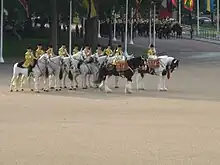 Les Drum Horse des Horse Guards britanniques sont sélectionnés sur leur capacité à porter deux gros tambours en argent[1], d'un poids total 45 kg[2], et à se laisser diriger par des rênes attachées aux pieds du cavalier[1]. De plus, ils doivent être tolérants aux bruits[8].