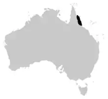 Cette espèce est endémique du Queensland en Australie. Elle se rencontre le long de la côte Nord entre Cooktown et Townsville, entre 100 et 1 500 m d'altitude[1]. La zone de répartition de l'espèce est d'environ 19 600 km2[2].