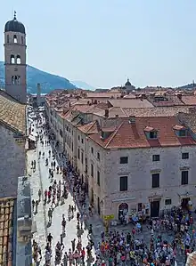 La Placa (ou Stradun) est une large avenue dallée tracée au milieu de la ville, sur l'ancien marécage qui séparait la Raguse latine du rocher de Dubrava sur le continent. Lorsque la ville s'agrandit au cours du Moyen Âge, elle assèche ce marais et en fait une artère.