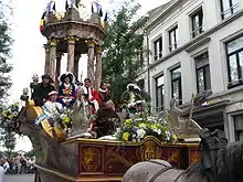 Il n'est pas possible, en l'état actuel des connaissances, de se faire une idée de ce que cette procession est devenue aux XVIe et XVIIe siècles. Fourdin[13] affirme qu'elle prit de plus en plus d'ampleur entre 1450 et 1550 mais qu'elle déclina, au cours de la seconde moitié du XVIe siècle, aussi rapidement qu'elle avait prospéré. La première de ces affirmations ne s'appuie sur aucun argument. La seconde, en revanche, est fondée sur l'état désastreux des finances communales, totalement ruinées par les innombrables subsides, taxes et réquisitions, sur les guerres, sur la peste, enfin, qui sévit presque sans discontinuer de 1578 à 1599[14]. En effet, le cortège était alors financé par la commune, la paroisse et les confréries. Cependant, en 1589 on dépense 136 livres pour un somptueux banquet qui réunit la comtesse de Beaurieu, accompagnée de monseigneur le baron Charles Ier de Trazegnies, les sieurs Dandelot et d'Ayseau « estant venus veoir jouer les histoires le jour de la procession en la maison eschevinalle, où survinrent pareillement monseigneur le comte d'Egmont avec Madame, le seigneur de Marchenelle et plusieurs gentilzhommes de leur suytte »[15]. La procession avait donc toujours un certain faste. En 1647, le magistrat accorde cent livres aux arbalétriers « à l'advancement de leur Gholiat qu'ils prétendent faire neuf, eu esgard que ycelui sert d'ornement à la procession »[16]. Il est, en outre, probable que le char de l’Église triomphante, inspiré par la Contre-Réforme, date de cette époque.
