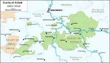La principauté d'Anhalt était un des États du Saint-Empire romain, situé en Allemagne centrale. Elle est levée par la maison d'Anhalt sur le territoire de l'ancien duché ethnique de Saxe en 1212, puis elle se divisa en une pluralité de petits États. En 1806, Napoléon Ier éleva les États d'Anhalt-Bernbourg, Anhalt-Dessau et Anhalt-Köthen en duchés qui sont devenus membres de la confédération du Rhin, puis de la Confédération germanique.