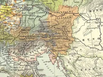 En 1374, les Habsbourg héritent également de la marche windique et de la Carniole-Blanche située à la frontière sud-est avec le royaume de Croatie. Par le traité de Neuberg en 1379, la Carniole intègre l'Autriche intérieure gouvernée par Léopold III de Habsbourg et ses descendants qui résident à Graz en Styrie.