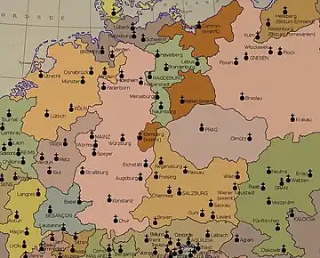 - les trois évêchés de Metz, Toul et Verdun, dont les évêques prirent le titre de comtes de ces villes et princes du Saint-Empire,
