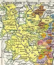 Le duché de Lorraine (en allemand : Herzogtum Lothringen[5]) est un ancien État de type monarchie héréditaire qui existe pendant huit siècles. Il est issu du partage de la Lotharingie en 959 qui scinde ce vaste royaume à dimension européenne[pas clair] en deux duchés distincts : la Basse-Lotharingie et la Haute-Lotharingie. À la suite de nombreux remaniements de son territoire mi-roman mi-germanique, le second duché[4], qui s'étendait encore jusqu'à Coblence à la confluence du Rhin et de la Moselle, actuellement en Allemagne, ainsi que jusque Bouillon en Belgique aujourd'hui, donne progressivement naissance à un duché qui sera le seul et dernier à garder le nom ancestral de Lorraine. Le qualificatif « Haute » sera très vite abandonné car l'État jumeau au nord n'aura qu'une durée de vie éphémère[6] et la distinction entre les deux duchés de l'axe lotharingien ne s'imposait plus.