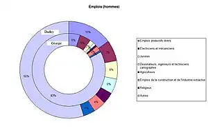 Pour la population active masculine, les principaux secteurs d'activité sont l'administration publique (11 %) et l'industrie papetière (11 %).