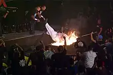 - Aided superbomb, souvent utilisé pour faire passer l'adversaire à travers une table enflammée à la ECW.