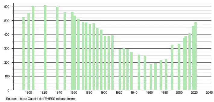 L'évolution du nombre d'habitants est connue à travers les recensements de la population effectués dans la commune depuis 1793. Pour les communes de moins de 10 000 habitants, une enquête de recensement portant sur toute la population est réalisée tous les cinq ans, les populations légales des années intermédiaires étant quant à elles estimées par interpolation ou extrapolation[18]. Pour la commune, le premier recensement exhaustif entrant dans le cadre du nouveau dispositif a été réalisé en 2008[19].