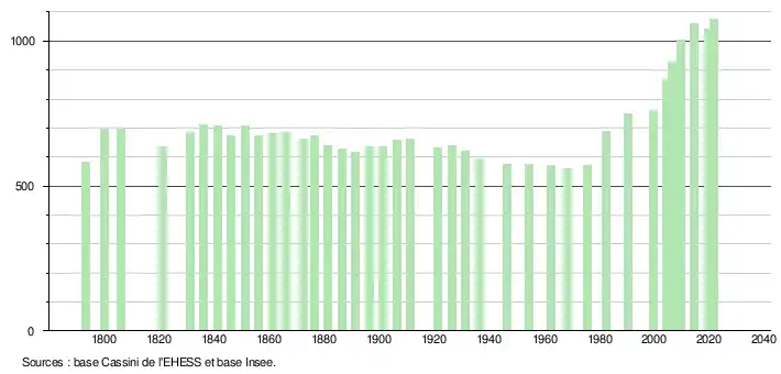 L'évolution du nombre d'habitants est connue à travers les recensements de la population effectués dans la commune depuis 1793. Pour les communes de moins de 10 000 habitants, une enquête de recensement portant sur toute la population est réalisée tous les cinq ans, les populations légales des années intermédiaires étant quant à elles estimées par interpolation ou extrapolation[21]. Pour la commune, le premier recensement exhaustif entrant dans le cadre du nouveau dispositif a été réalisé en 2004[22].