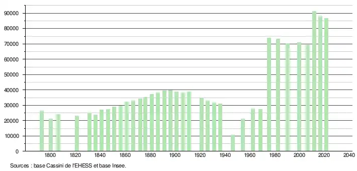 Avec 86 788 habitants en 2021, elle est la cinquième ville la plus peuplée de la région Hauts-de-France, la seconde hors de la métropole lilloise après Amiens. Ses habitants sont appelés les Dunkerquois et les Dunkerquoises. La « cité de Jean Bart » est au centre de la communauté urbaine de Dunkerque qui regroupe dix-sept communes et compte 192 635 habitants en 2020[1]. Elle est également au cœur d'une aire d'attraction comptant 258 733 habitants en 2021[2], répartis sur soixante-six communes dont sept dans le Pas-de-Calais.