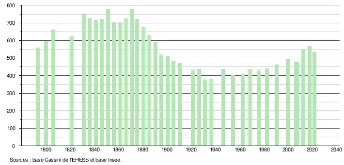 L'évolution du nombre d'habitants est connue à travers les recensements de la population effectués dans la commune depuis 1793. Pour les communes de moins de 10 000 habitants, une enquête de recensement portant sur toute la population est réalisée tous les cinq ans, les populations légales des années intermédiaires étant quant à elles estimées par interpolation ou extrapolation[15]. Pour la commune, le premier recensement exhaustif entrant dans le cadre du nouveau dispositif a été réalisé en 2007[16].