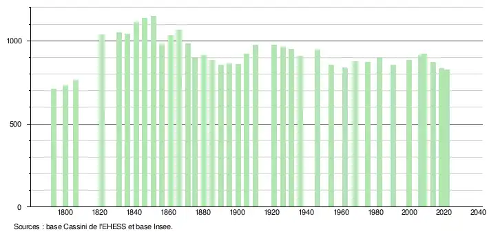 L'évolution du nombre d'habitants est connue à travers les recensements de la population effectués dans la commune depuis 1793. Pour les communes de moins de 10 000 habitants, une enquête de recensement portant sur toute la population est réalisée tous les cinq ans, les populations légales des années intermédiaires étant quant à elles estimées par interpolation ou extrapolation[19]. Pour la commune, le premier recensement exhaustif entrant dans le cadre du nouveau dispositif a été réalisé en 2008[20].