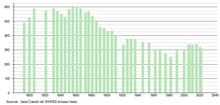 L'évolution du nombre d'habitants est connue à travers les recensements de la population effectués dans la commune depuis 1793. Pour les communes de moins de 10 000 habitants, une enquête de recensement portant sur toute la population est réalisée tous les cinq ans, les populations légales des années intermédiaires étant quant à elles estimées par interpolation ou extrapolation[32]. Pour la commune, le premier recensement exhaustif entrant dans le cadre du nouveau dispositif a été réalisé en 2005[33].