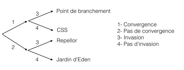 L’exemple pris est ici un modèle étudiant le trade-off résistance aux perturbations r et taux de colonisation c. À partir de la fonction d’invasion du mutant rare (: fitness), on peut calculer les gradients de sélection sur ces deux paramètres (r et c) en dérivant la fonction de fitness. Les dérivées de ses gradients donnant deux matrices : la matrice Hessienne et la matrice Jacobienne (Figure 7). Ces matrices permettent de connaître si l’équilibre (visualisé Figure 6) correspond à une stratégie évolutivement stable (ESS), à un point de branchement, un repoussoir ou s’il est convergent stable.