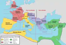 La tétrarchie de Dioclétien avait également semé les bases d’une séparation régionale. Le regroupement des provinces en diocèses eux-mêmes réunis au sein de préfectures du prétoire dont le préfet était directement responsable à l’empereur, tout en réaffirmant l’autorité ultime de ce dernier, faisait en quelque sorte des préfets du prétoire des premiers ministres régionaux[27].