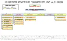 À l’origine, les commandements de l’infanterie et de la cavalerie étaient distincts (« magister peditum » pour l’infanterie, « magister equitum » pour la cavalerie), le commandant des forces « en présence » se distinguant du reste de l’infanterie (magister peditum praesentalis). Puis les deux premières fonctions furent réunies pour former celle de commandant des soldats (« magister militum »)[46],[47],[48]. Au cours des siècles, l’armée devint de plus en plus dépendante du recrutement chez les peuples conquis (« barbarisation de l’armée »), principalement chez les Germains. Les unités ainsi formées devinrent les « unités de fédérés » (« foederati »)[49].
