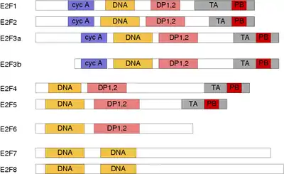 Schéma des séquences en acides aminés des différentes E2F (l'extrémité Nter est à gauche et la Cter à droite) mettant en évidence les domaines de liaison aux protéines et à l'ADN :