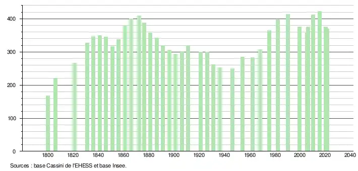 L'évolution du nombre d'habitants est connue à travers les recensements de la population effectués dans la commune depuis 1800. Pour les communes de moins de 10 000 habitants, une enquête de recensement portant sur toute la population est réalisée tous les cinq ans, les populations légales des années intermédiaires étant quant à elles estimées par interpolation ou extrapolation[24]. Pour la commune, le premier recensement exhaustif entrant dans le cadre du nouveau dispositif a été réalisé en 2005[25].