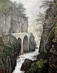 ![]() Pont et gorge du Hourat, lithographie extraite de "Promenades dans les Pyrénées. Vues, Sites, Costumes et Mœurs les plus remarquables de ce Pays Intéressant." par Ch. Mercereau et Ch. Maurice. - Paris, ca. 1850 |